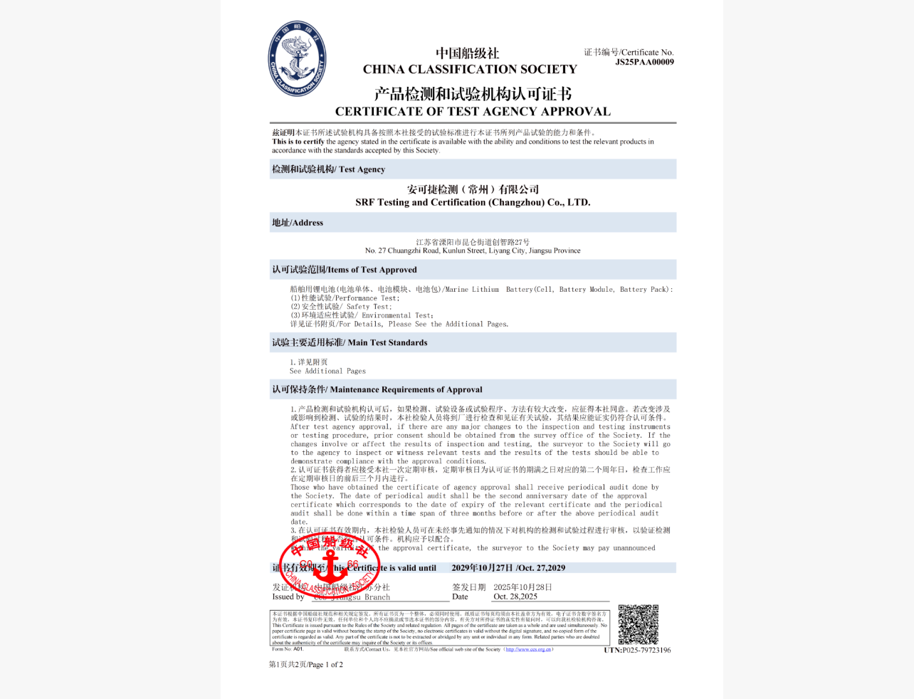 安可捷检测(常州)有限公司正式获得中国船级社(CCS)颁发的产品检测和试验机构认可证书(证书编号:JS25PAA00009)。