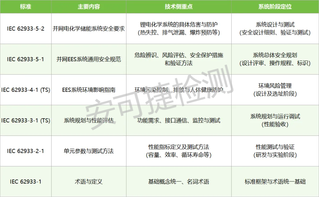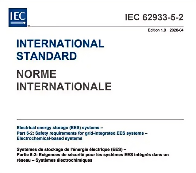 本期聚集标准是:IEC 62933-5-2电能存储(EES)系统 - 第5-2部分:并网EES系统的安全要求 - 基于电化学系统
