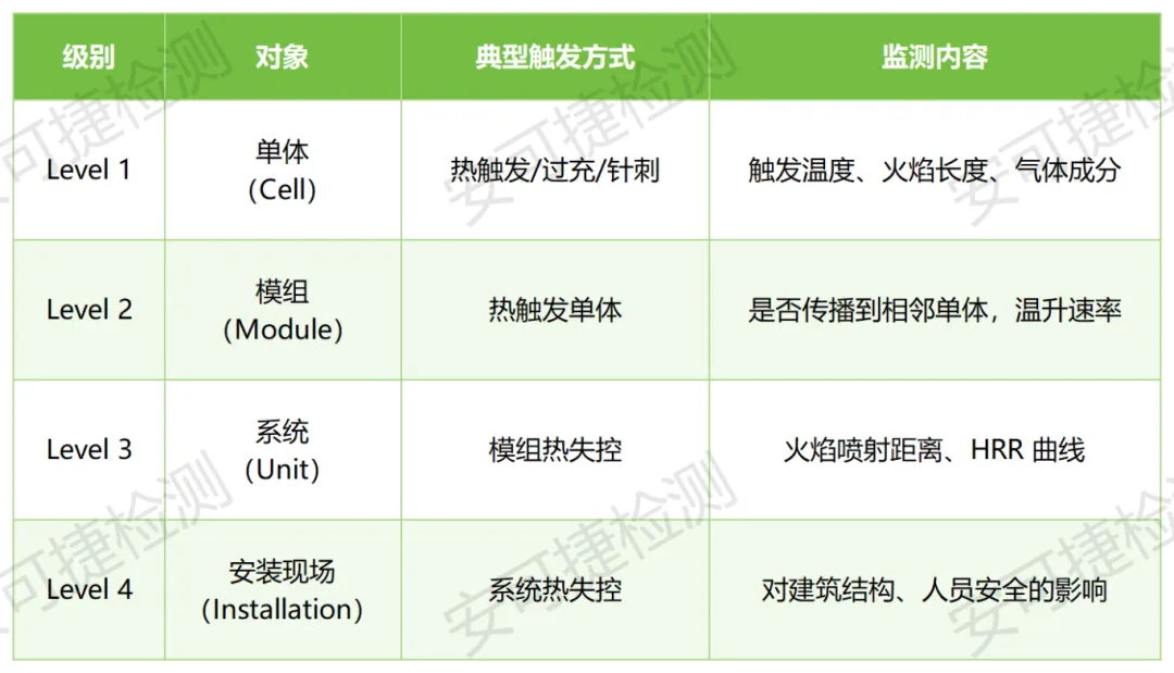 UL 9540A 分为四个层级,每一级的目标是观察热失控是否会向上一级结构传播。