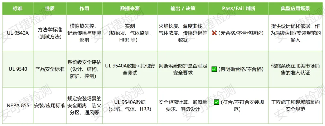 UL 9540 是系统安全标准,UL 9540A 提供数据支持,不直接给 Pass/Fail。