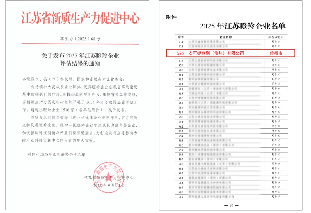 近日,江苏省新质生产力促进中心正式发布了2025年瞪羚企业评估结果,安可捷检测(常州)有限公司凭借其卓越的创新能力与高成长性,成功入选 “2025年江苏省瞪羚企业” 名单。