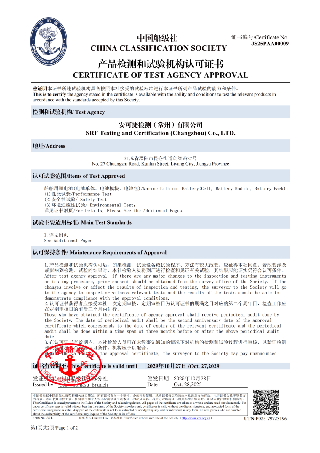 证书明确认可安可捷在“船舶用锂电池(电池单体、电池模块、电池包)”方面的检测资质,涵盖性能、安全性与环境适应性三大类别试验,为公司在船舶新能源领域的业务拓展奠定坚实基础。