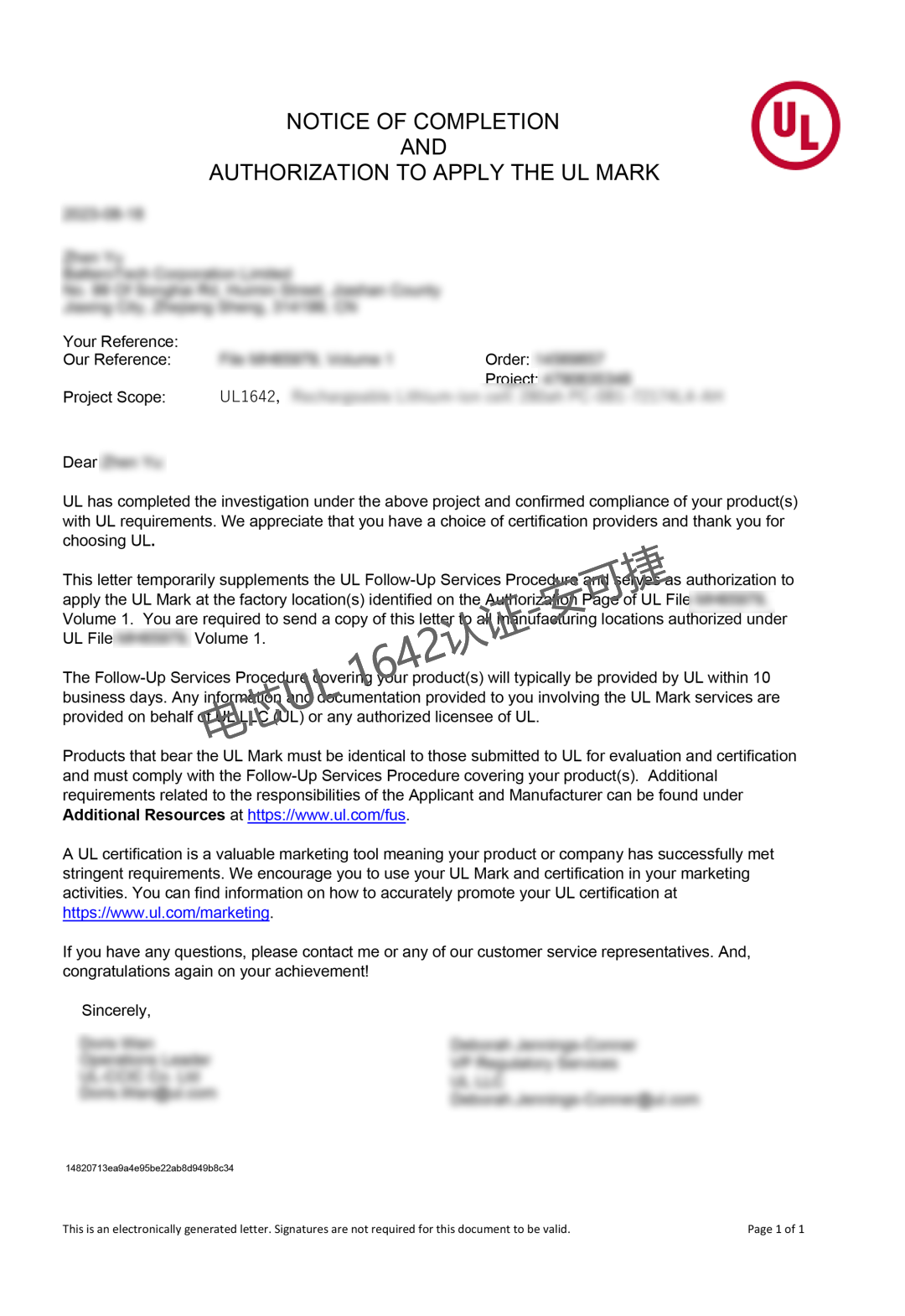 通过与安可捷的合作和支持,某新能源公司成功地通过了UL1642认证,取得了重要的认证证书。这不仅证明了该公司电芯产品的高质量和安全性,也将进一步增强其在市场上的竞争力并提升了品牌形象。同时,由于UL1642认证是国际公认的认证标准,也将帮助该公司拓展国际市场,吸引更多全球客户的关注和合作。