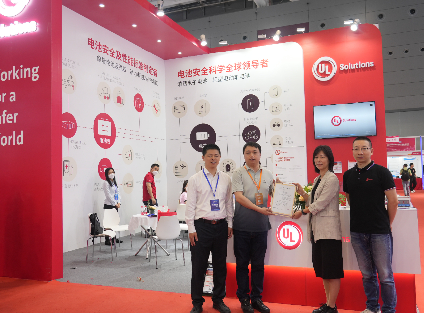 2023年5月17日,安可捷与 UL Solutions 在2023CIBF展会上共同为双登集团的电芯产品颁布了 UL1973证书,标志着该电芯产品已通过 UL1973认证标准。出席本次活动的有 UL Solutions-CMIT高级销售经理-Jessica Liu、双登集团-技术总监-黄杨以及安可捷-TIC国际认证部总监 Napoleon 等嘉宾。