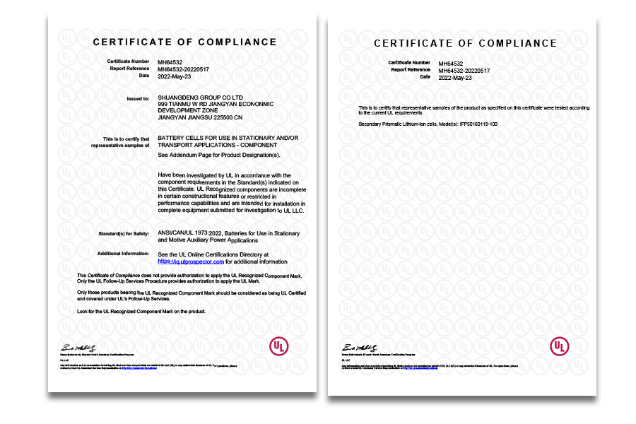 电芯是当前储能领域最基础的电力电子元器件之一,其安全性直接影响到储能产品的性能与使用寿命。而 UL1973是储能电池安全的重要指标。由此,双登集团通过全面、严格的安全和性能测试,使得其生产的电芯产品符合 UL1973 安全标准。