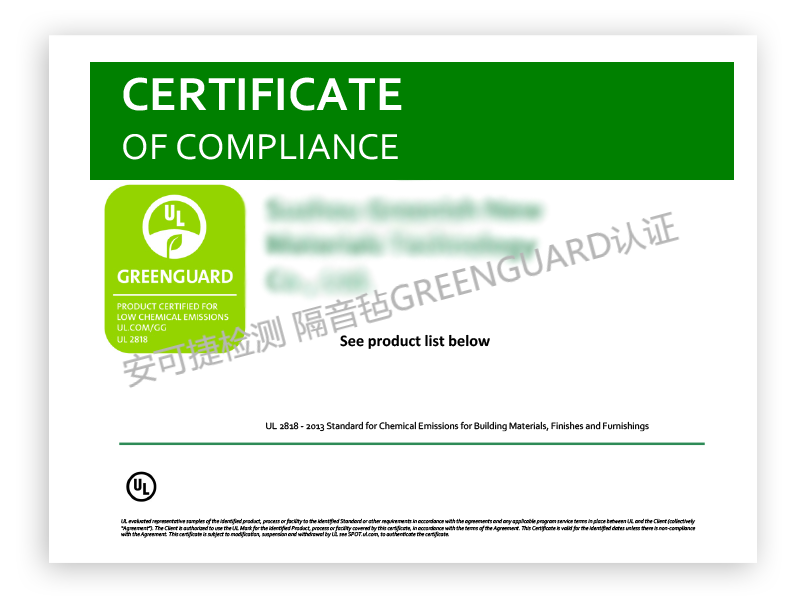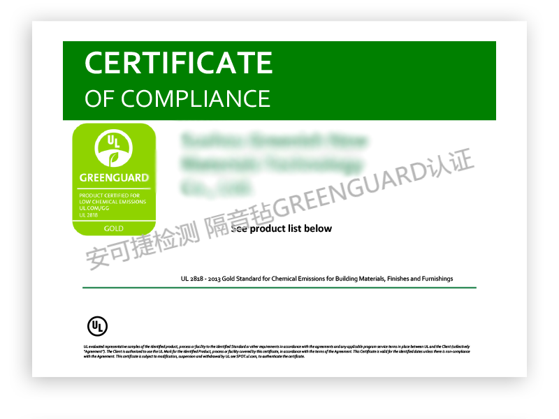 安可捷为苏州某材料公司进行隔音毡产品GREENGUARD认证、GREENGUARD GOLD认证,该公司成功获证:GREENGUARD证书、GREENGUARD GOLD证书,这标志着该公司隔音毡产品在健康、环保性能方面取得了新的突破,赢得了国际权威认可。