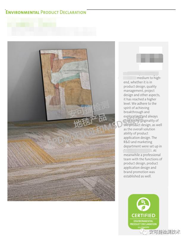 安可捷为无锡某材料企业提供从地毯产品生命周期评价(LCA),产品环境信息声明(EPD)报告到报告审核支持的一站式服务,协助该企业于11月4日获得UL EPD副证。