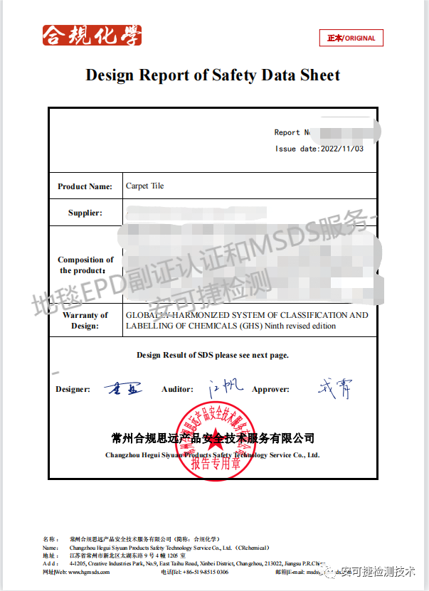 11月4日、10日,安可捷为无锡某材料企业进行地毯产品的EPD副证认证和MSDS服务,该企业地毯产品,让“绿色”、“安全”定义健康;