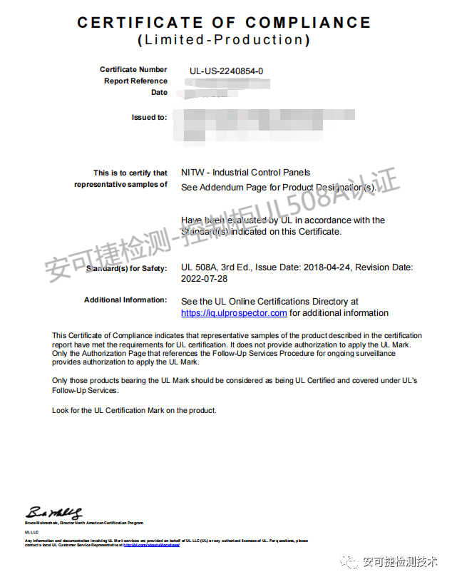 安可捷根据控制柜UL508A的要求,协助苏州某设备股份有限公司确认柜内零部件选择及布局是否合适以及准备控制柜认证需要的各项资料,待资料与样品均审核通过后,UL工程师现场进行贴标,同时工厂可拿到控制柜UL508A UL认证证书。
